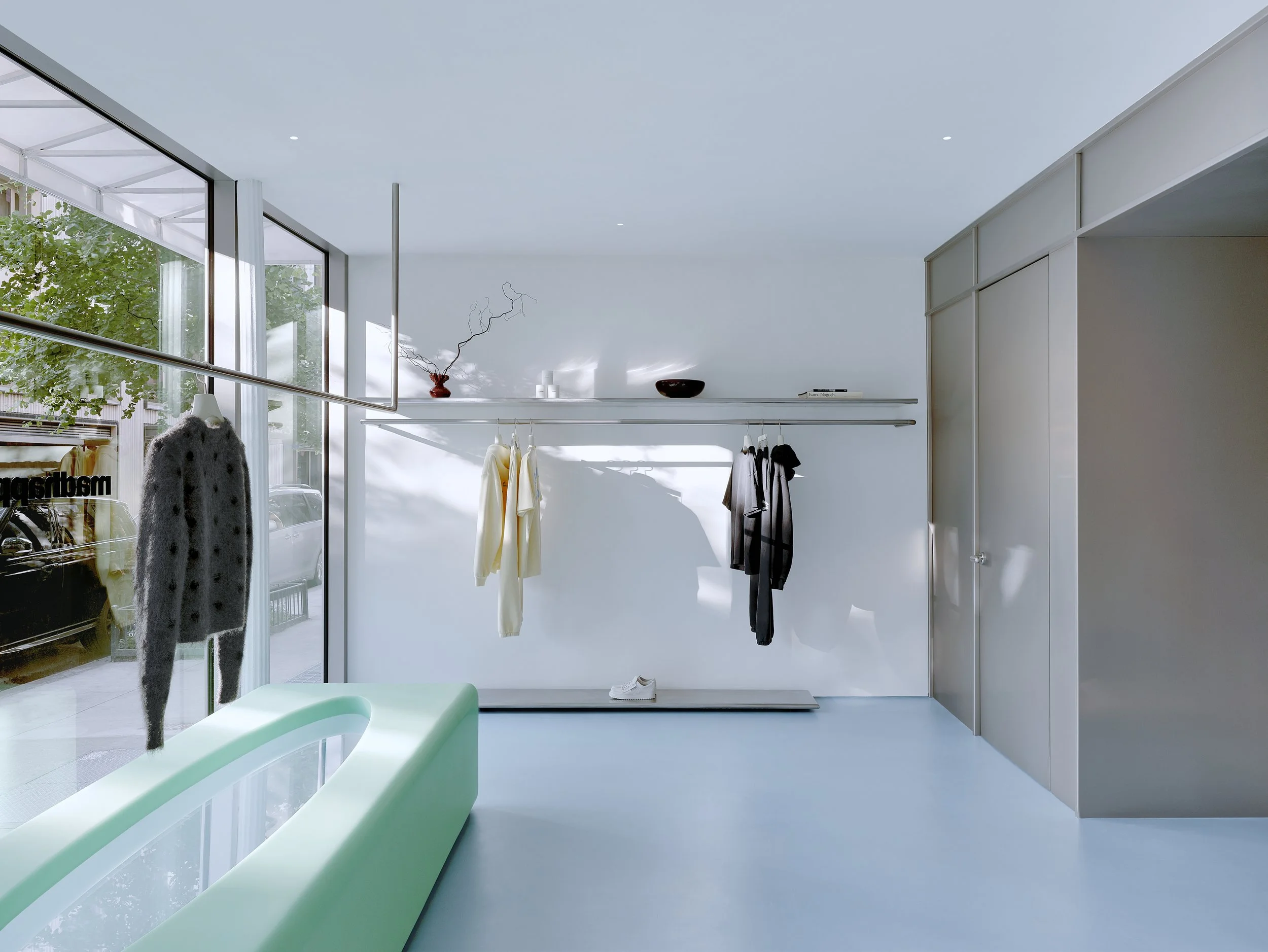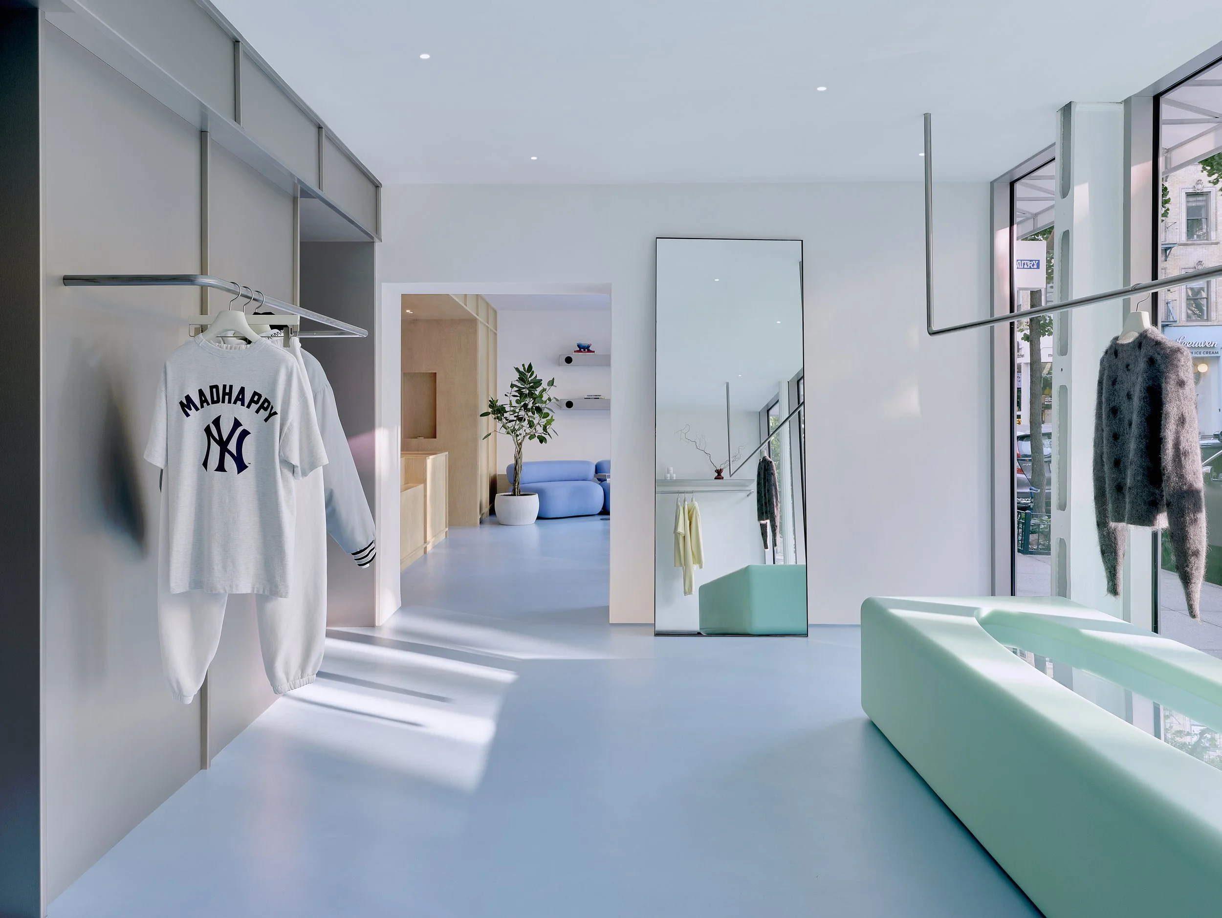 Subtle integrated lighting accentuates textured surfaces and curated displays, while focused spotlights draw attention to key merchandise moments. The result is a balanced environment that feels fresh, optimistic, and unmistakably Madhappy.